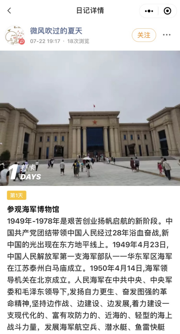 中国人民解放军海军博物馆,是中国唯一一座反映中国海军发展的军事博物馆,是人民海军的历史高地、精神高地、文化高地。7月20日,研学团来到了中国人民解放军海军博物馆,回顾人民海军在党的坚强领导下不断成长壮大的壮丽史诗。通过参观了解到了我国近现代海军的起源与发展,看到博物馆中展示的各种舰艇模型和武器模型等,为我国海军在历届党和国家领导人的带领下变得日益强大而感到骄傲与自豪,同时也向为海军发展做出卓越贡献的战士们致以崇高敬意。团队成员们一起登临国产第一艘驱逐舰、功勋舰济南舰,登上甲板,仿佛站在了碧波万里的海洋,凝望着祖国的万里海疆。参观过程中,成员们纷纷表示,博物馆里面的一件件展品、一段段历史让人大受震撼。为了守卫这广袤的蓝色土地,中国海军正在迅速地发展壮大,人民海军在炮火中诞生、战斗中成长、发展中壮大,一路劈波斩浪,纵横万里海疆,驰骋远海大洋,朝着建成世界一流海军的目标阔步前进。